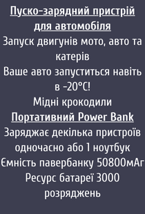 Портативний переносний запускний пристрій – вкрай корисний, а іноді і незамінний пристрій для заряду портативних пристроїв з функцією запуску двигуна автомобіля. Завдяки можливості короткочасно видавати струм великої сили, цей “Jump starter” може завести Ваш автомобіль, якщо у нього розрядився акумулятор (наприклад на морозі).